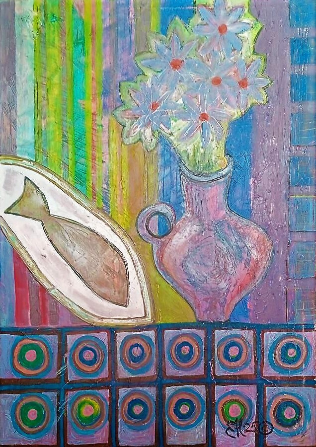 Хотя изображены обычные бытовые предметы — рыба на блюде, ваза с цветами, скатерть, обои на заднем плане — они представлены не как реалистичные объекты, а как символы, наполненные эмоциональным и цветовым значением.