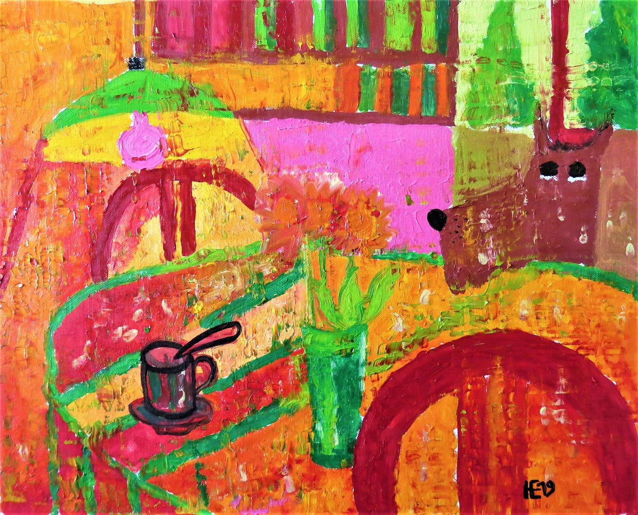 О картине: стол, чашка, ваза с цветами, стулья, люстра, полка с книгами, окно, голова собаки